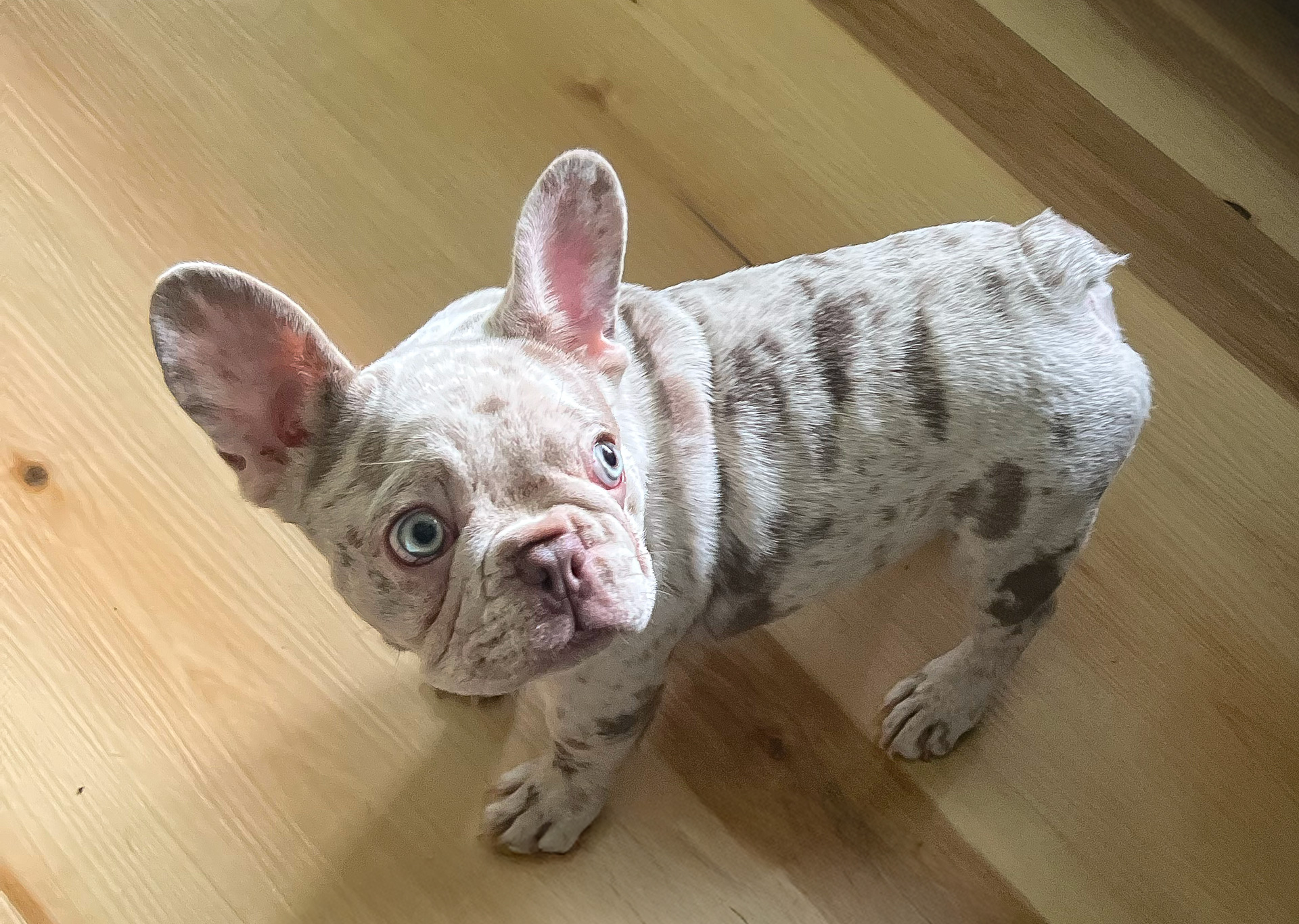 Luna is our little firecracker wrapped in the softest lilac fawn merle coat you’ve ever seen. She’s playful, ridiculously smart (she learned “sit pretty” in about 30 seconds), and has the most stunning hazel eyes that stop people in their tracks. Don’t let the fancy color fool you—she’s 100% substance over flash. Luna is clear across the board genetically, has zero breathing issues, and moves like a dream.